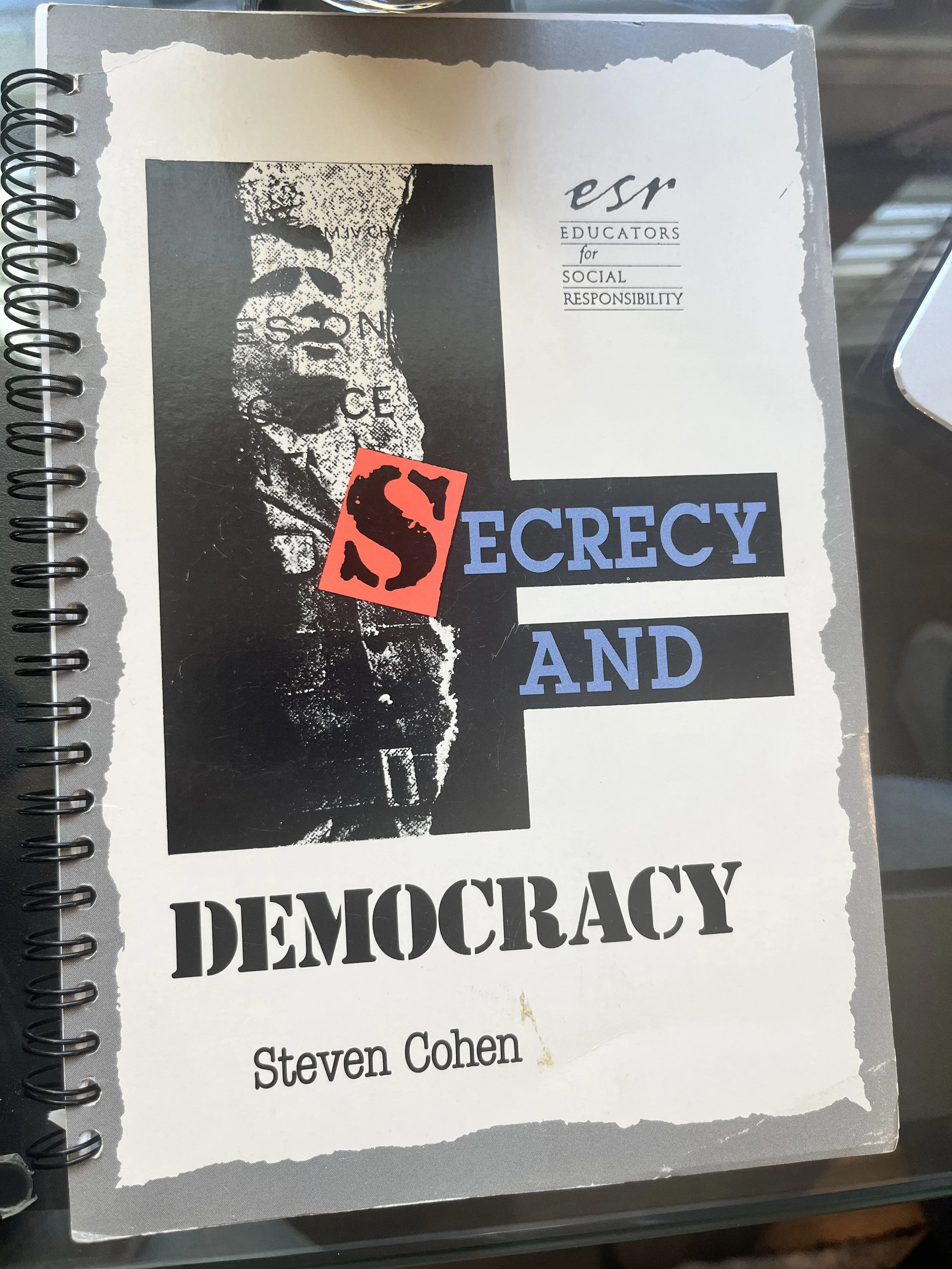 Steve wrote the above, typical of his modesty and warmth. I first met Steve when I was looking for the Director of our nascent Inquiry High School Global Issues simulation Initiative. With Steve, we turned it into one of the premiere global affairs program for high school students and teachers, radically different from Model UN in its insistence that while students learn their roles, their objective was to break through the stasis and paralysis of typical diplomatic negotiations. Steve was so successful that we happily parted formal ways as he was hired as a lecturer and professor at Tufts School of Education, where he has mentored hundreds of Masters students, seeking to enter the teaching ranks as Social studies teachers. The informal part is much more fun and entertaining as his witticisms are renowned and his university office is plastered with New Yorker cartoons. He beat me regularly at tennis and we have enjoyed evenings watching the Red Sox at Fenway park. We had one significant outcome when we reached out to Steve to create the Educators for Social Responsibility, SECRECY AND DEMOCRACY.