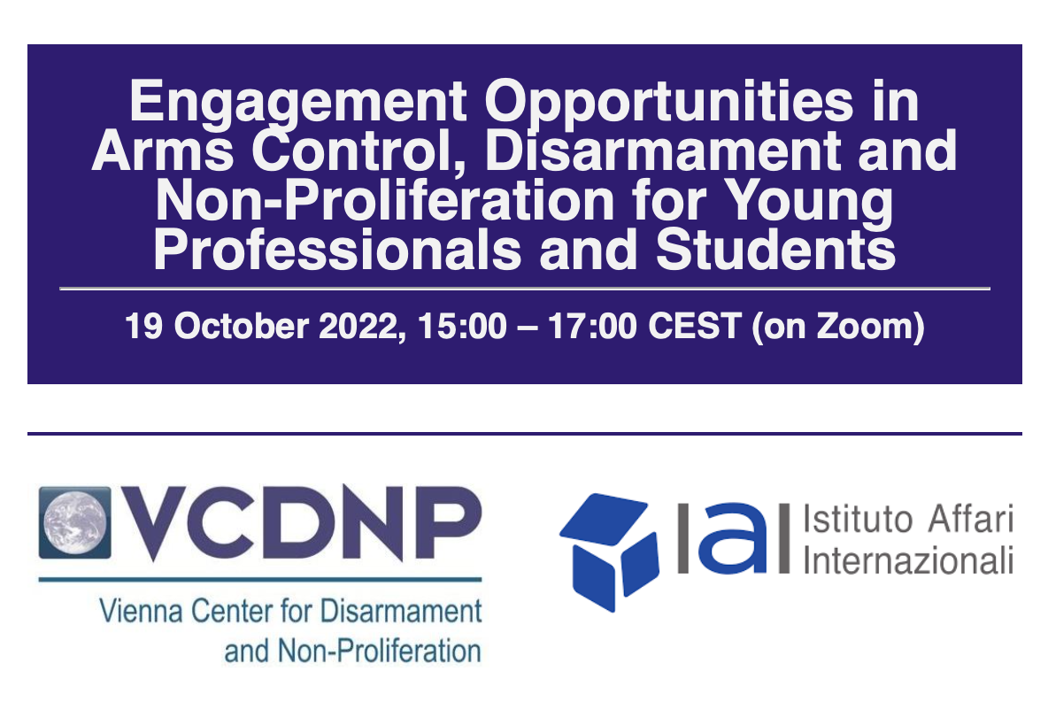 The Vienna Center for Disarmament and Non-Proliferation (VCDNP), the Istituto Affari Internazionali (IAI), and International Student/Young Pugwash (ISYP) cordially invite you to the event “Engagement Opportunities in Arms Control, Disarmament and Non-Proliferation for Young Professionals and Students.”