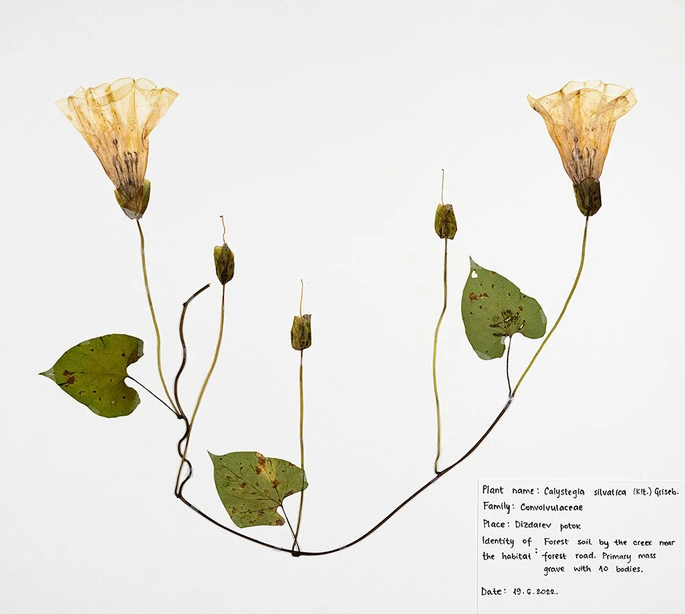 Čirkinagić, who was born in Prijedor and now lives in Copenhagen, began “Herbarium” in 2004. The project is based on a classical herbarium that classifies flora with the difference being that all the plants have been collected from the site of mass graves in Bosnia and Herzegovina. The plants are gathered, dried, and mounted behind glass along with information about the mass grave site. Čirkinagić has made 70 new pieces specifically for the exhibition in Sarajevo after traveling to Prijedor in April this year and collecting the last plants in August.