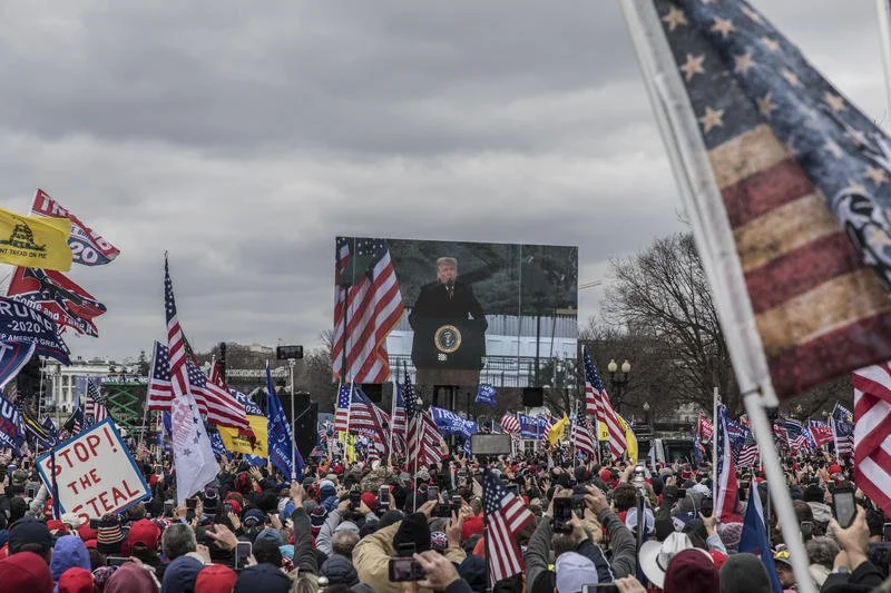 Trump followers rally at the Washington Monument listening to President Trump addressing them on January 6, 2021. Photograph by Christopher Morris / VII.