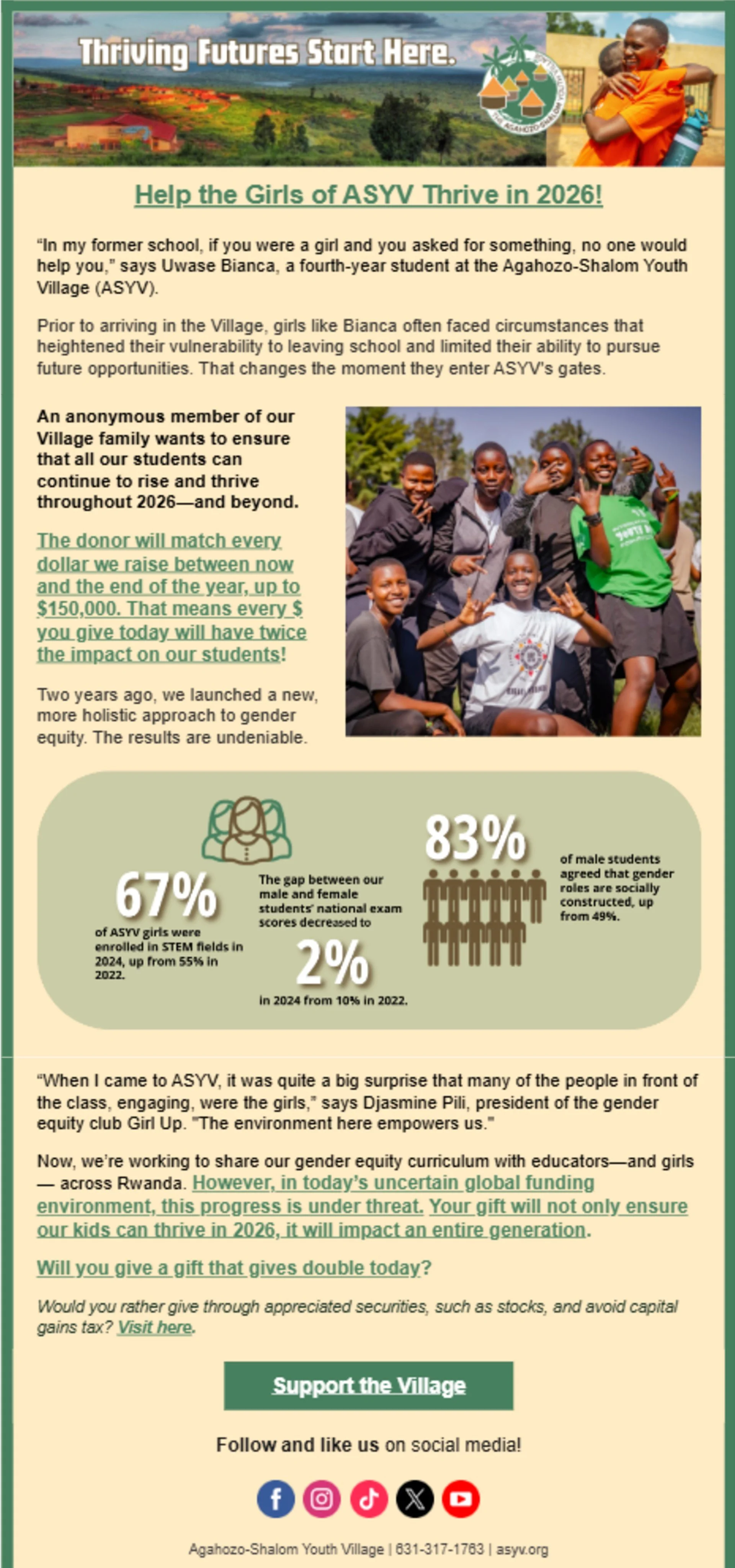 Agahozo-Shalom Youth Village (ASYV) in Rwanda offers a year-end matching challenge up to $150,000 through December 31, 2025, doubling contributions to education, leadership training, and gender equity programs for vulnerable girls facing poverty or post-genocide challenges.