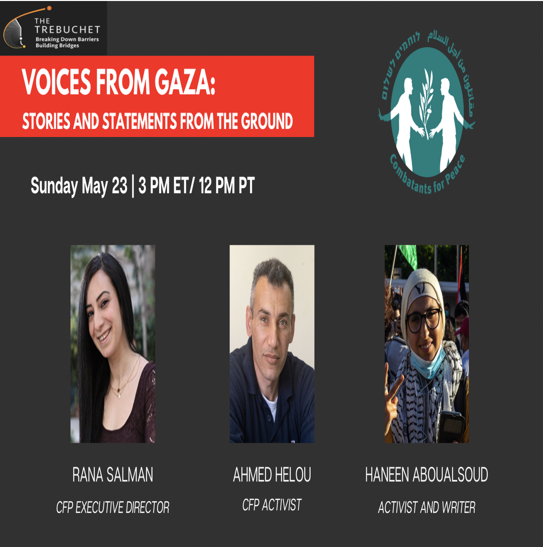 Here is a link to the recording from yesterday's Combatants for Peace zoom briefing call with our Palestinian Board Member, Aziz Abu Sarah and Israeli activist, Shai Goren. It goes very long (over 2 hours!), so Combatants for Peace suggests watching the first 50 minutes or so, as it will give you a very good understanding on the background leading up to the current violence.